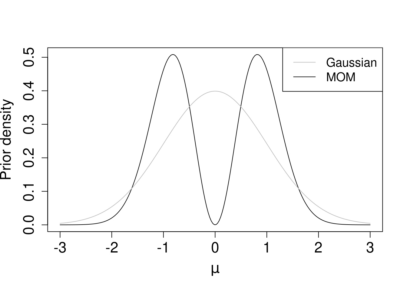 The figure below shows the density function for \(g=1/3\) and \(\sigma^2=1\) and compares it to a Gaussian where also \(\sigma^2=1\). As discussed both distributions have the same variance, but the MOM is bimodal and vanishes at \(\mu=0\). Philosophically, one might view the Gaussian prior as problematic. It’s a prior conditioning on \(\mu \neq 0\), i.e. it is supposed to embed the knowledge that \(\mu\) cannot be 0, yet the most likely value under the Gaussian is \(\mu=0\). This prior fails to satisfy the model separation principle. If data are truly generated by \(\mu=0\), such data will have non-negligible probability not only under \(\gamma=0\) but also under \(\gamma=1\), because the latter assigns high prior mass to \(\mu=0\).