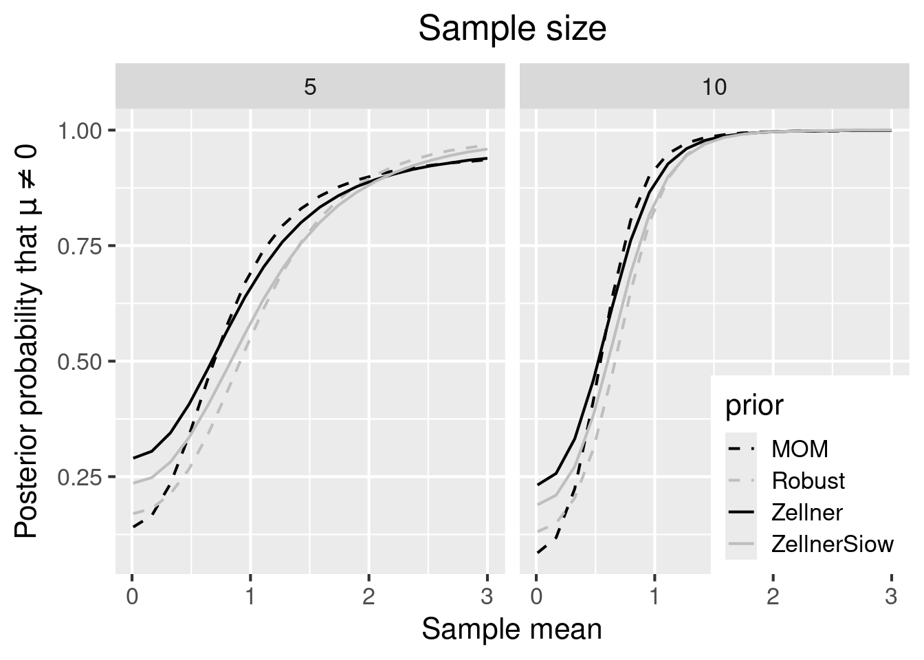 names(pp) <- c("n", "xbar", "Zellner", "MOM", "ZellnerSiow", "Hyper-g", "Robust")