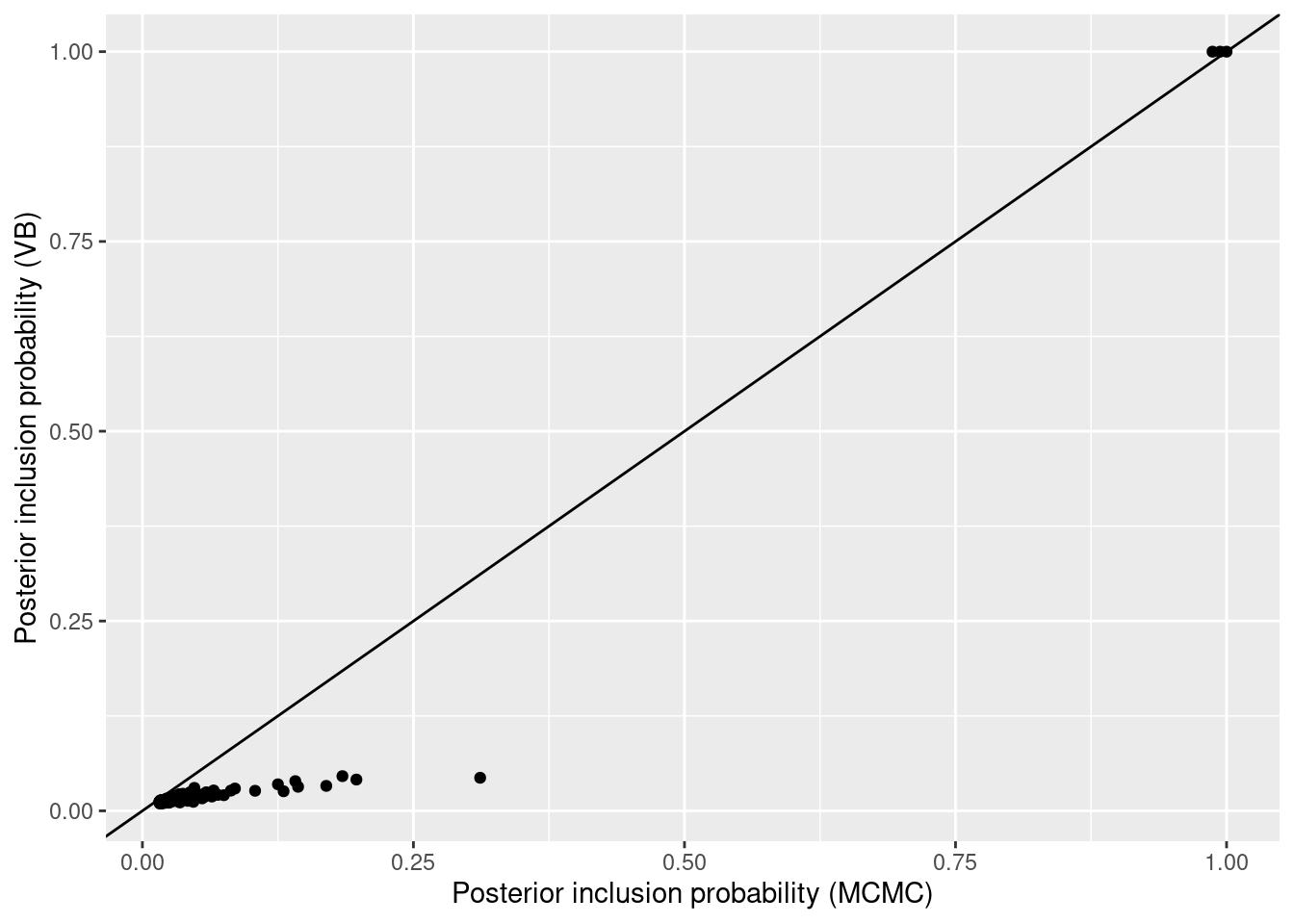 From purely a Bayesian point of view this shows variational inference may provide a poor approximation to the desired posterior. This is different from saying that the exact Bayesian solution provides better inference than the variational one, in terms of detecting the genes that are truly associated with TGFB. As an additional check in this direction, we compare the average posterior inclusion probability between genes that were inside/outside the mouse list. For the MCMC estimates there is a big difference, roughly 0.023/0.007 = 3.3, which aligns with what’s expected biologically. For the variational estimates the difference is much smaller.