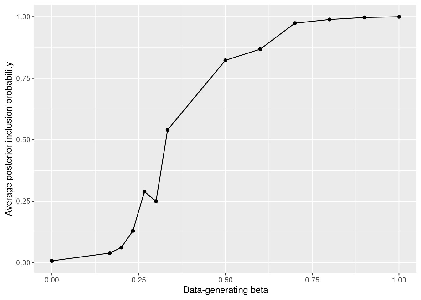 The left panel in the figure below shows that for small \(\beta_j\) there is low statistical power, that is a probability of selecting the corresponding covariates, and that this is an issue for EBIC, LASSO-EBIC and BMA. For BMA this is particularly problematic: the Bayesian uncertainty quantification is off, from a frequentist standpoint. Small \(\beta_j\)’s are assigned a high \(P(\beta_j = 0 \mid y)\), and taking the latter posterior probability at face value would give strong Bayesian evidence that the corresponding covariates have no effect. This example illustrates that BMA results should be interpreted as a conservative analysis where small evidence for inclusion may simply be due to low statistical power, rather than conclusive evidence that the effects are zero.