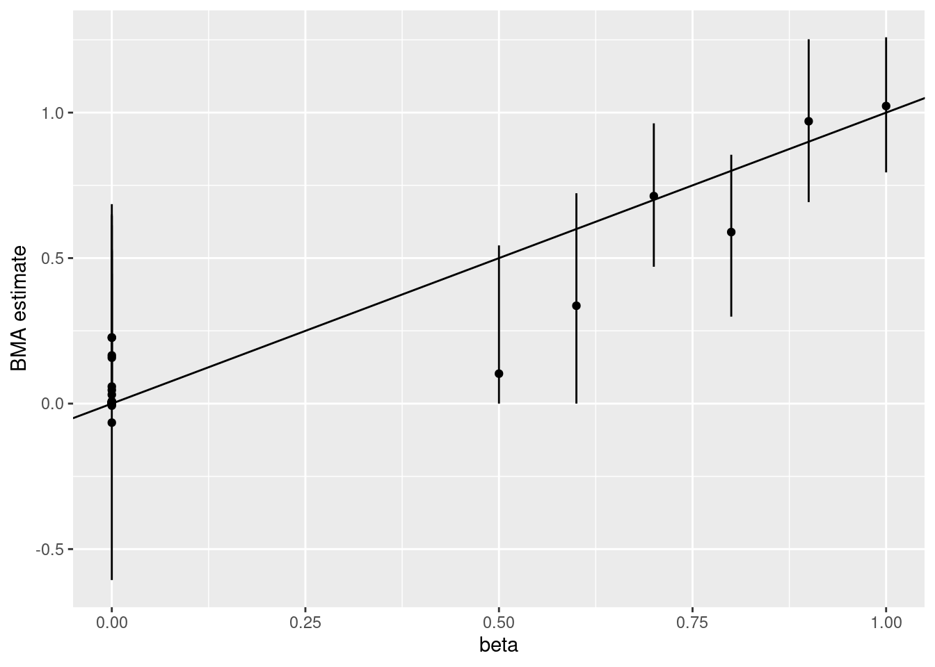 BMA returns point estimates and 0.95 posterior probability intervals, plotted below. The posterior interval of each \(\beta_j\) contains the data-generating \(\beta_j\) in this example, and the point estimates for the truly zero \(\beta_j\)’s are quite close to zero.