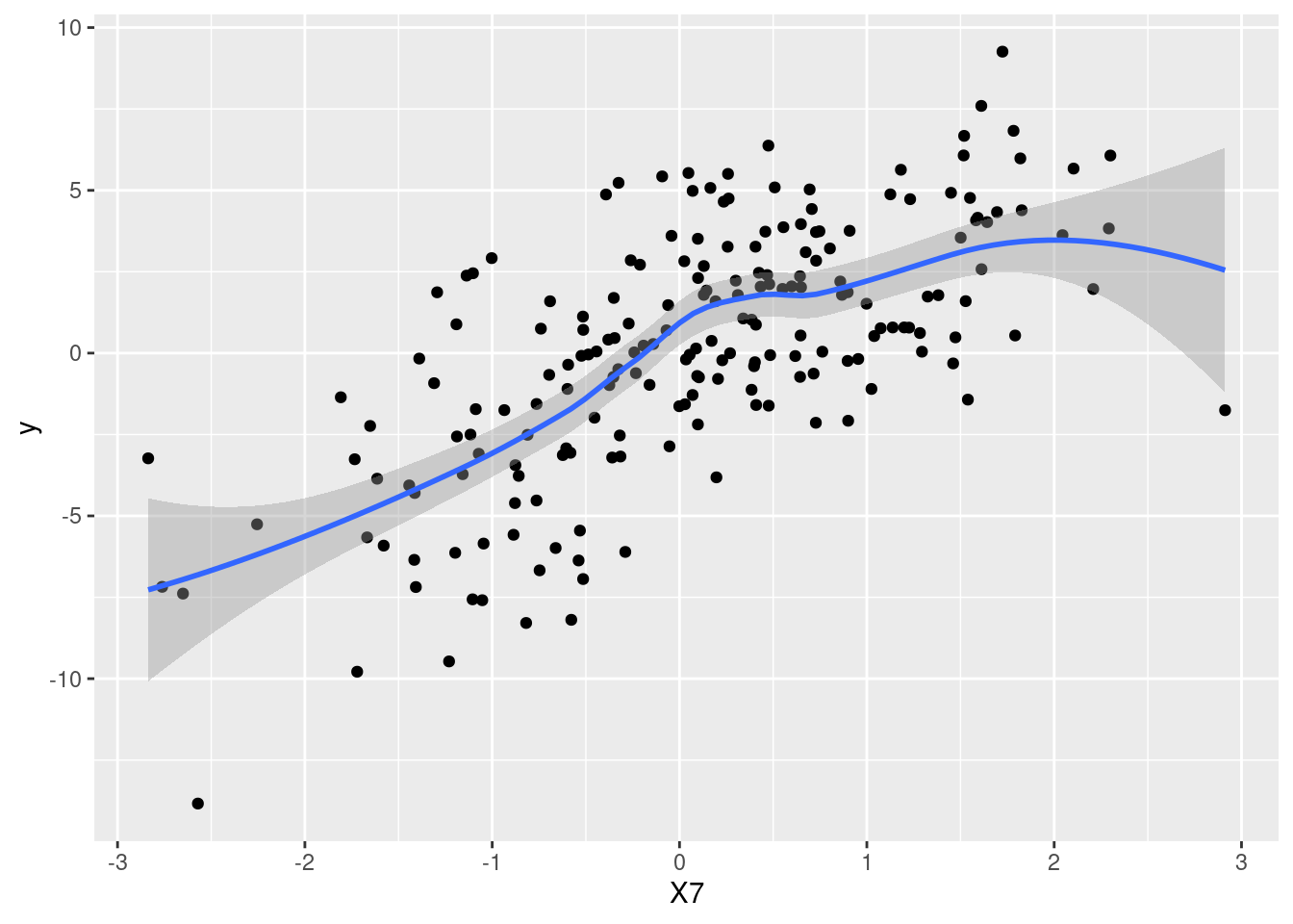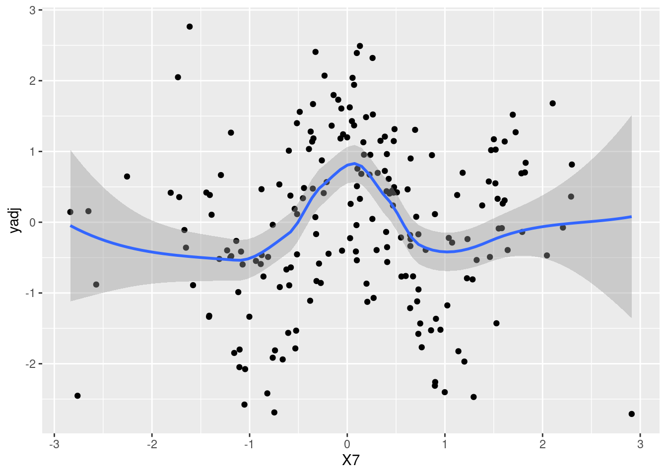 While this is not a very hard exercise, it’s also not completely trivial. For example, a scatter-plot of the outcome versus the seventh covariate (left panel below) doesn’t suggest that it may have a non-linear effect. If instead one plots partial residuals obtained after removing the effect of covariates 1-6, that is \(e_i= y_i - \sum_{j=1}^6 x_{ij} \beta_j\), the non-linear effect becomes apparent (right panel). That is, in this example the key to discover the non-linear association is to adequately capture the effect of other covariates.